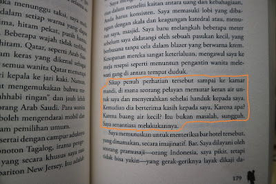 Alih-alih hanya sekedar mencari “makna” dari kebahagiaan, Eric Weiner langsung bergerak dan mencari tempat di mana kebahagiaan itu ada sebenarnya. Dari 10 tempat yang dibahas dalam buku ini, kisah pencarian kebahagiaan Eric ke Qatar dan India-lah yang menjadi bagian favoritku. Ada sebuah paragraf di halaman 179 yang secara otomatis memancing tawa lepasku. Paragraf yang aku bicarakan adalah ini: